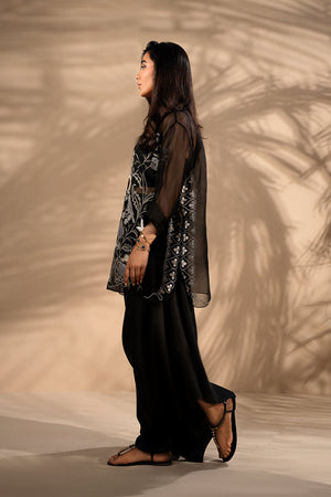 A sheer ebony toned organza top is brought to life with ivory and moonstone floral embroidery, set against a contemporary silhouette. The beaded neckline adds a hint of shimmer, layered over a precisely tailored charmeuse tube top. Paired with a fluid charmeuse draped pants, the look unfolds with understated drama and modern edge.