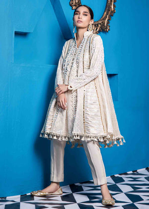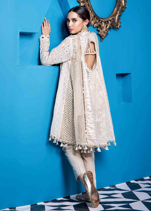 Description: Ararat is presented in an intriguing ivory color, this modern combination features an open flared silk mesh neckline. Adorned with tassels and mirror work.