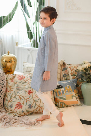 Periwinkle self on self embroidered cotton kurta with straight dyed cotton pants.