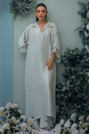Effortlessly chic in soothing sage. This loose fit kurta features box sleeves and a shirt collar, accentuated with delicate schiffli detailing on the sleeves. Paired with wide-legged pants, it's the epitome of relaxed sophistication. Elevate your style with this captivating ensemble.