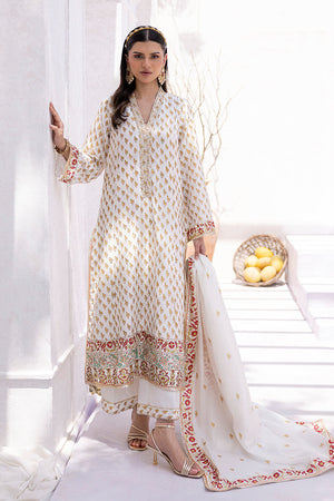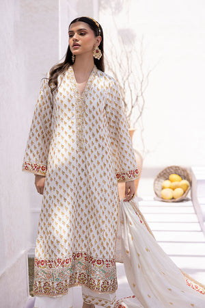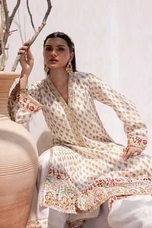 Ivory A-line kurta crafted in a printed base featuring repetitive gold motifs across the entire silhouette. The neckline is adorned with embellished detailing that includes sequins and beadwork. The sleeves and daman are finished with intricate borders showcasing multicolor thread embroidery in red and green, with gold zari accents. The kurta is paired with straight ivory pants featuring delicate scalloped embroidery on the hem. The ensemble is completed with an ivory medium silk dupatta, decorated with small bootis and an embroidered border that mirrors the kurta’s daman detailing.