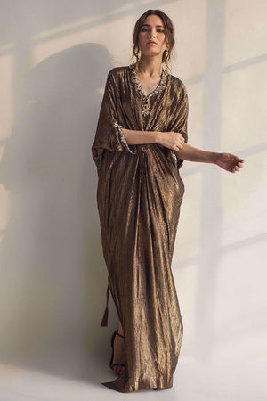 This kaftan showcases the complex weave of the gold and silver zari work all over. The simplified look is enhanced by beskope metal ornaments along with crystals, pearls and beads. The sleek straight look is uplifted by the beautifully embellished.