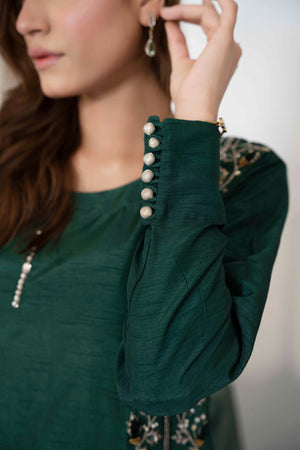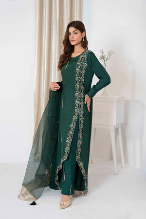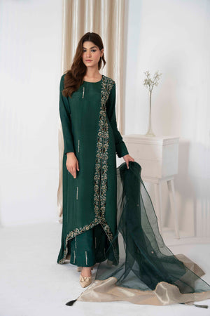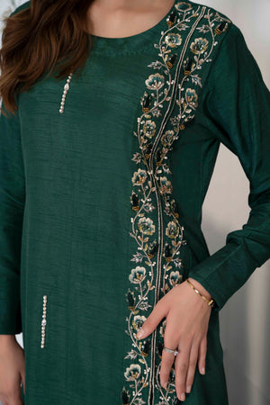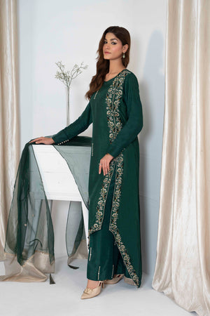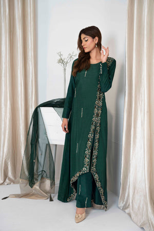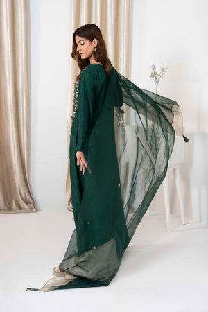 Step into a world of sophistication with our beautiful bottle green ensemble! Crafted from delicate Korean silk adorned with subtle hand embellishments that add a touch of allure. Paired effortlessly with straight trousers enhance with embellishments and embroidered organza dupatta.