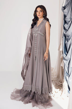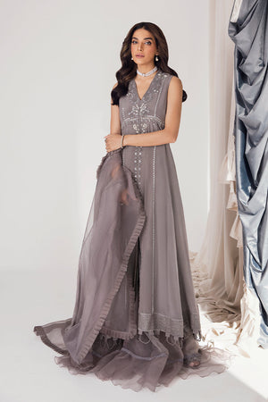 Mink grey silk paneled front open dress detailed with heavy dabka, zari and swarovski work and is beautifully highlighted, it is to be paired with organza sharara with ruffle and organza dupatta for the complete festive look.