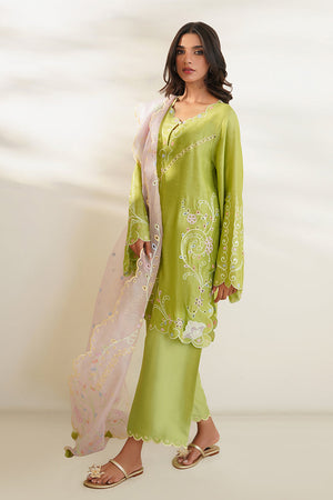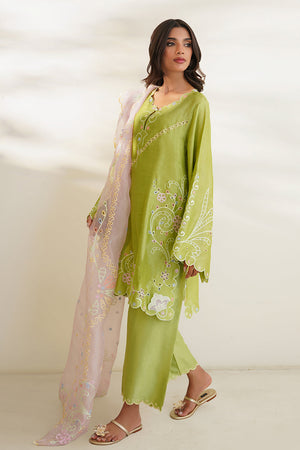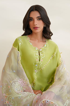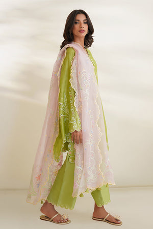 'A pastel green shirt cut from khaddi silk features eyelet embroidered details with a scalloped neckline. Paired with a worked blush pink organza dupatta and matching rawsilk culottes.