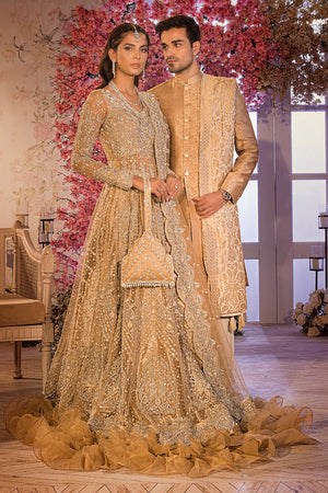 Taupe pure kattab self jamawar sherwani with front button down detailing. Comes with a beige pajama. Paired with a off white and gold pure kattan jamawar shawl with tassel detailing.