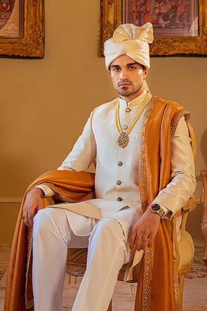 An off white schiffli pure raw siIk sherwani. Paired with a shawl. Comes with pure raw silk pajama. Completes the regal look by our add on of a matching traditional groom turban.