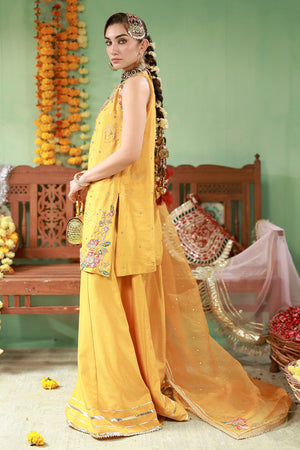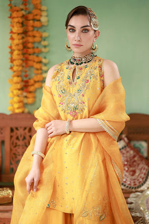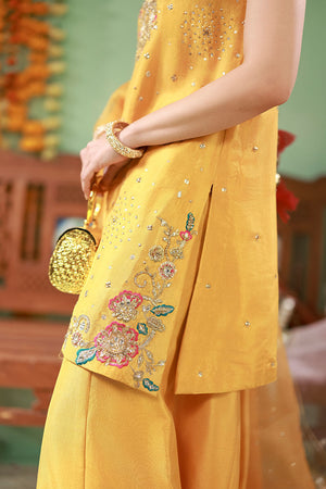 Pure raw silk halter neck short shirt in marigold, embellished with gota, sequins, dabka, Swarovski stones, and pink and emerald green resham accents. Paired with raw silk dhaka pants featuring gota detailing. Finished with an organza net dupatta with sequins and gota work.