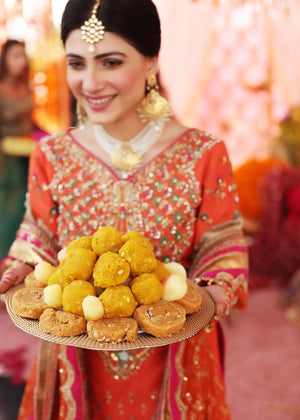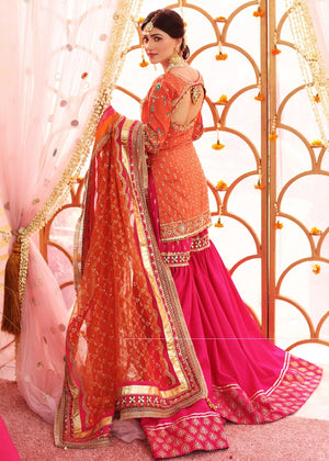 A never-before-seen look of festive colours. Raw-silk base shirt with meticulously crafted crystal,swarovski and tassel embellishment. This stunning ensemble is completed by beautifully embellished block printed farshi gharara and net dupatta with the details of gold tilla and sitara.The shipping charges for all articles barring Bridals are as follows:
