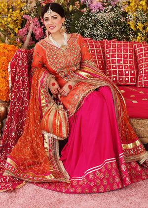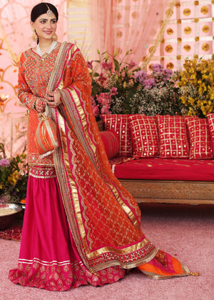 A never-Before-seen look of festive colours raw silk base shirt with meticulously crafted crystal, Swarovski and tassel embellishment. This stunning ensemble is completed by beautifully embellished block printed fasshi gharara & net Dupatta with the details of gold tilla & sitara.