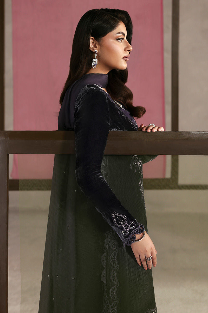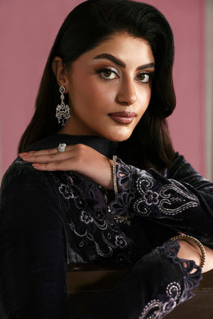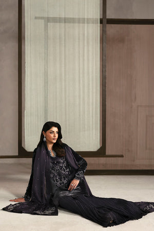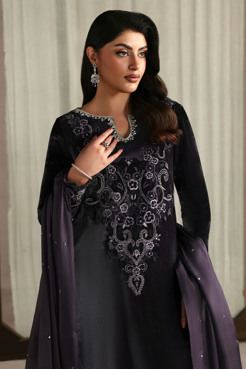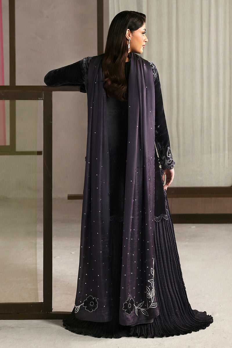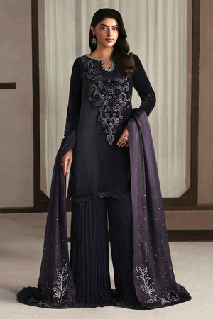 An elegant grey ensemble featuring a pure velvet shirt paired with a flowing medium silk sharara. The look is completed with a pure silk dupatta, adding a touch of sophistication and timeless grace.