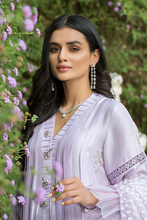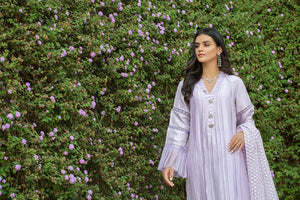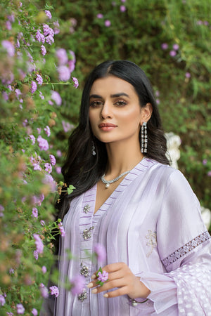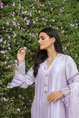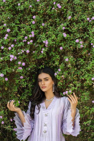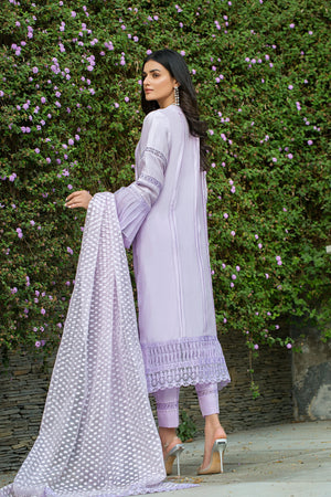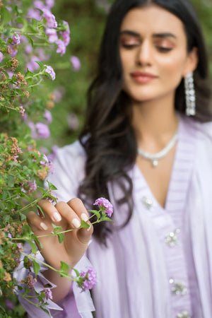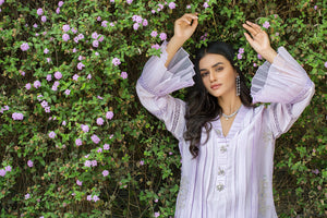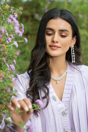 Description: Feel light with this beautiful lilac Raw Silk dress. Its stitching details makes it lovelier more than any outfit. Enhanced with embroidery and embellishment on it. Pair it up with jacquard organza dupatta having embroidered border and Raw Silk straight pants.
