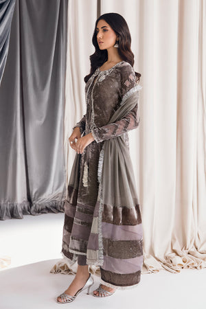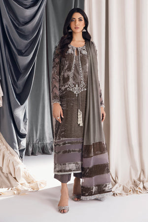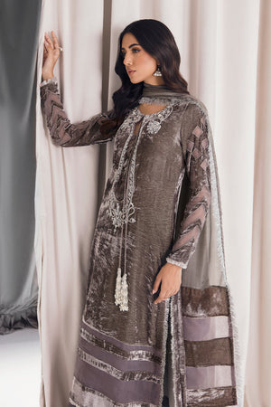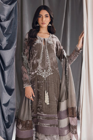 A majestic stone-grey velvet shirt with zari and dabka work on the neck complimented by a detailed work of beautiful tassels and organza patch work on sleeves and border paired with raw silk, ihzaar and china silk dupatta with kiran lace.