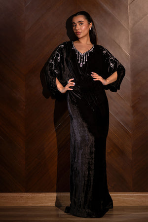 This exquisite kaftan, crafted with meticulous attention to detail, features a captivating sweetheart neckline that elegantly frames the décolleté. The intricate embellishment of tiki stones adds a touch of charm, creating a truly unique and sophisticated piece. The flowing silhouette and luxurious fabric ensure both comfort and style, making it the perfect choice for a glamorous evening event.