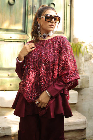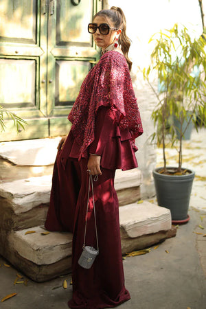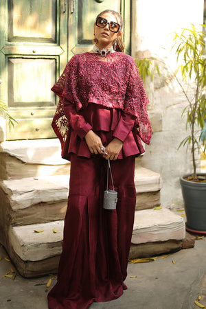 A deeply enriched ensemble in maroon shade with mesmerising fully embellished cape. Pure raw silk under shirt double layer peplum with cold shoulders. Paired along box pleat gharara pants making this outfit just so right for upcoming festive season.The shipping charges for all articles barring Bridals are as follows: