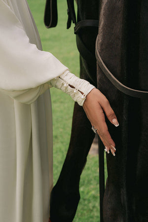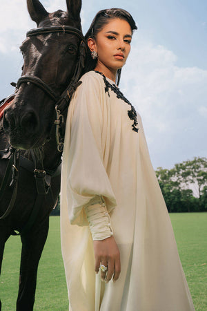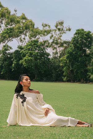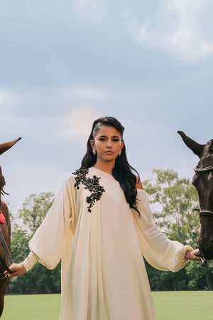 A breathtaking ivory silhouette, elegantly flowy, features intricate black embellished motifs that are gracefully placed along the shoulder. The outfit is complemented by fitted cuffs and details, which serve to enhance its overall aesthetic appeal.