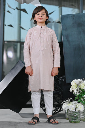A soft dusty pink kurta with delicate self-embroidery, paired with crisp white pants.