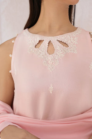 Long kurti in powder pink raw silk, designed with a halter neckline. The neckline is finished with anchor thread embroidery and features cutwork detailing along the edges. The kurti has a straight silhouette with clean side seams. Paired with a raw silk izaar, finished with lace detailing on the side slit. The dupatta is in medium-weight silk, scattered with anchor thread bootis across the fabric, spaced evenly for balance.
