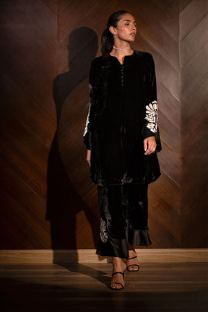 This sophisticated ensemble, featuring a rounded hem shirt with bell sleeves and matching pants, exudes timeless elegance. The intricate chawal taka embroidery in white and off-white on the sleeves and pants, while the shamouse panelling creates a striking visual contrast. The rounded hemline and appliqué detailing further elevate the overall aesthetic, making this outfit a true statement piece.
