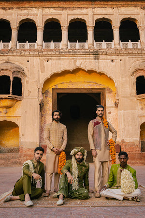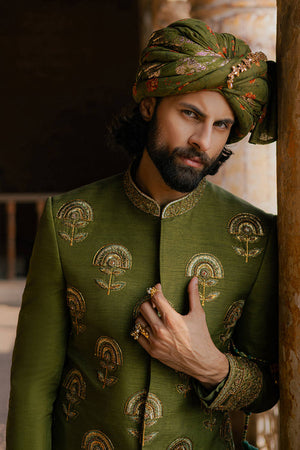 Aurangzeb, from the 'Raag Darbari' collection inspired by the legendary musician Tansen, is a masterful creation designed for Mehendi celebrations. Crafted from olive green raw silk, this sherwani is adorned with resham thread embroidery depicting Mughal gulnari floral motifs, further enriched with intricate adda work, evoking the grandeur of Asif Jah Haveli. An exquisite pairing of a pure karandi kurta in a deep olive green, adorned with kacha tilla baddla metallic thread embellishments. The accompanying karandi trousers features meticulously embroidered tilla detailing at the bottom. This ensemble offers versatility, perfect when paired with a olive green raw silk sherwani for a grand Mehendi, or worn alone for an understated yet elegant look.