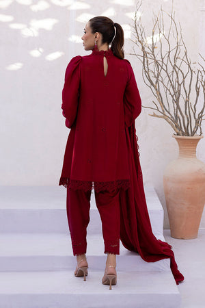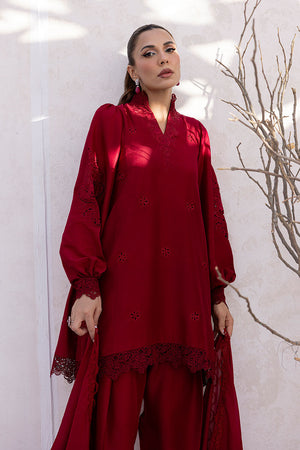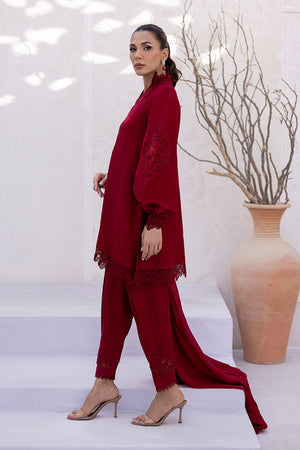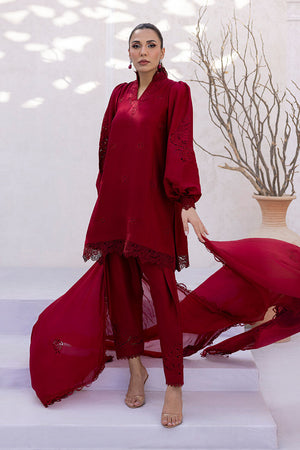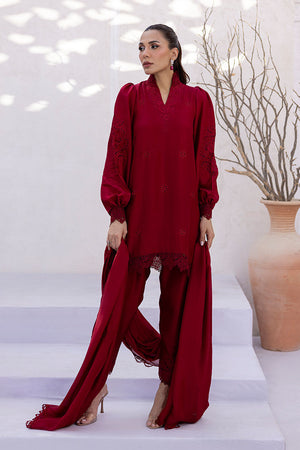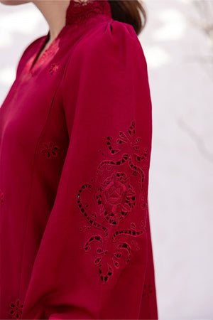 Deep red kurta with full-length puffy sleeves, featuring schiffli-style cutwork along the lower sleeve panels. The neckline is embroidered with rose-inspired motifs in a tonal thread, placed symmetrically across the front. The dupatta includes small rose-style bootis placed at regular intervals, finished with floral lace edging that matches the embroidery motifs. All elements follow a consistent floral theme in both layout and technique.