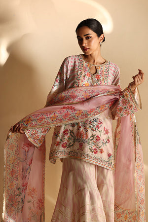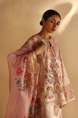 Radiating elegance, a serene blush hued khaddi silk shirt is adorned with intricate geometric and floral print elevated by gold gota accents. A finely embroidered vine runs along the hemline and keyhole neckline while harmonious blend of floral and linear designs decorate an organza dupatta with gota borders. Paired with a matching pure rawsilk tapered shalwar.