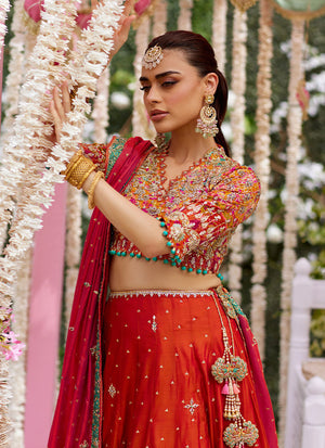This beautiful lengha in a vibrant two tone kataan silk is a testament to timeless elegance and intricate craftsmanship. The hand blocked lengha choli is beautifully adorned with kora, dabka, and threadwork, creating a luxurious texture and captivating detail. The choli is complemented with kataan silk lengha featuring delicate gota work and a richly hand embellished block printed border, adding a traditional touch to the ensemble. To complete the look, a two tone orangey pink kataan silk dupatta draped gracefully over the shoulders is adorned with sitara chann all over, providing a subtle yet dazzling shimmer. The dupatta is elegantly finished with a contrasting Banarsi border that enhances its regal appeal, while hand worked motifs on the corners add a playful and festive touch. Together, these elements create a harmonious blend of traditional artistry and contemporary design, making this outfit a standout choice for any celebratory occasion.