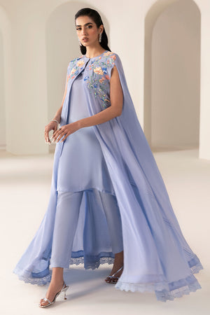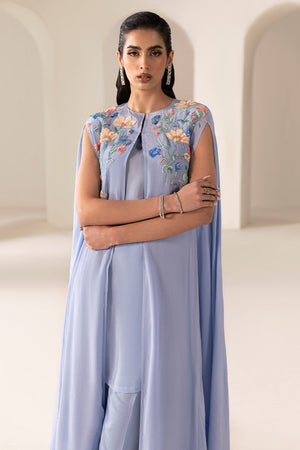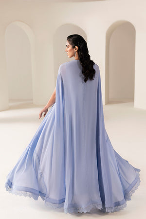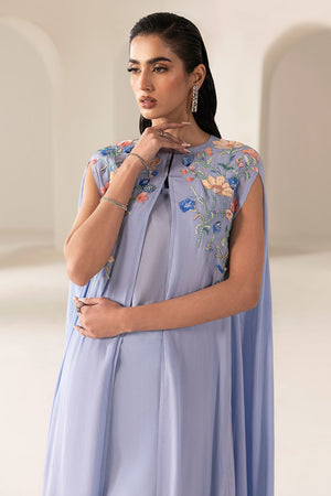 A pictographic resemblance of Greek goddess in seen in sky blue grip long cape style. It has stunning hand embellishment on neckline comprising sequins and beads.