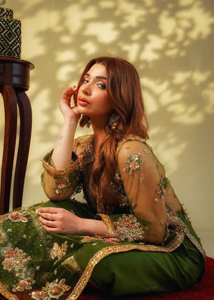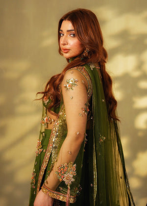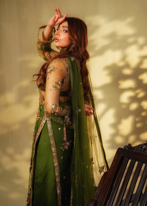 Description: AVIRA is a stunning outfit combining modern style with traditional Mastery, featuring intricate details and a rich green palette, perfect for special occasions.