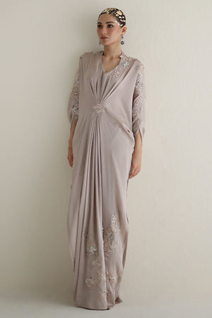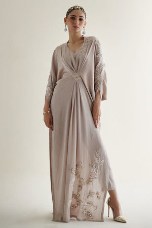 Introducing our sea salt lily silk high slit kaftan with pants, a captivating ensemble that exudes elegance and grace. Crafted from luxurious Lily silk, the kaftan features a high slit design that adds a touch of allure to your silhouette. Embellished with intricate detailing including resham, zari, cutdana, moti, sequins, and pearls, this ensemble is perfect for making a statement at any occasion. Paired with matching Lily silk fused pants, this ensemble offers both style and comfort. Elevate your wardrobe with this chic and sophisticated ensemble that effortlessly blends luxury and glamour. The model's Kaftan length is 58.The shipping charges for all articles barring Bridals are as follows: