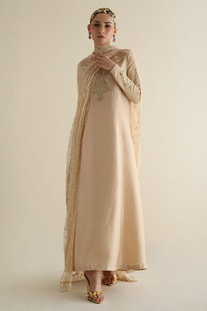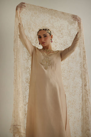 Introducing our tapioca pearl pure raw silk prince panel, a line shirt, a masterpiece of elegance and grace. Crafted from pure raw silk 80 gms, this exquisite shirt features intricate handwork of Kamdani, dabka, naqshi, sequence, and tiki stones adorning the neckline and sleeves. Paired with a luxurious Chantilly dupatta embellished with lace and hangings in the same tone, this ensemble exudes timeless sophistication. The model's shirt length is 52.The shipping charges for all articles barring Bridals are as follows: