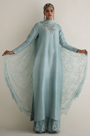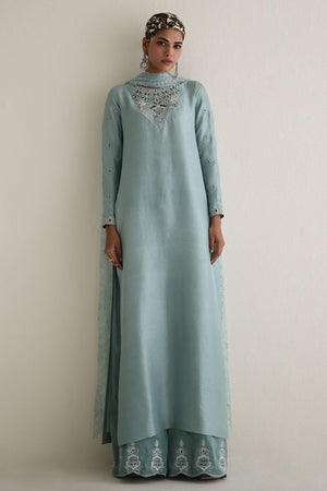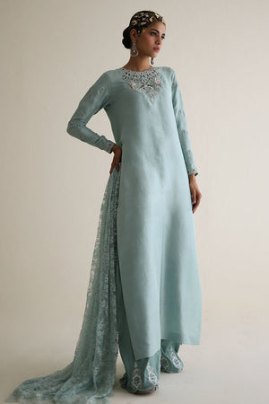 Introducing our bleached aqua pure raw Silk Straight Shirt, a vision of elegance and charm. Crafted from premium raw silk 80 gms, this shirt boasts exquisite embroidery featuring resham, zari, cutdana, tiki stones, and sequins on the front neck, back, and sleeves. Paired with candy crape culottes adorned with resham and zari embroidery on the bottom, this ensemble exudes sophistication. Complete the look with our Chantilly dupatta for an added touch of grace and finesse. The model's shirt length is 53.The shipping charges for all articles barring Bridals are as follows: