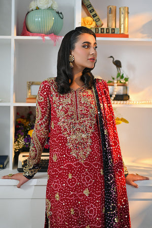 Classic and traditional, is the opulence of our maroon and black ombré chunri ensemble, crafted on luxurious crepe fabric. The long shirt is paired with elegant black raw silk izaar pants, both adorned with intricate gold zari, maroon resham, nakshi, dabka, and sequins work, highlighted by multi-color tiki stones. The ensemble is completed with a matching ombré chunri dupatta, meticulously embellished with Kamdani work, adding a touch of timeless sophistication.