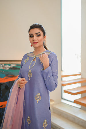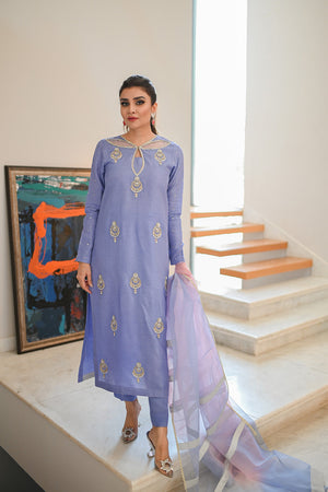 Ayezel features a wondrous hue of lavender playing a soulful symphony. The subtle ensemble features majestic motives of embroidery paired with organza dupatta and pants.