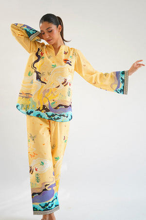 Comfort meets glam in this sunshine yellow co-ord set cut from jacquard lawn. The scenic print, inspired by the mystical elements of nature, sets the tone along with a geometric ivory and ebony border on the sleeves and the hem of the pants.