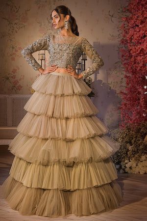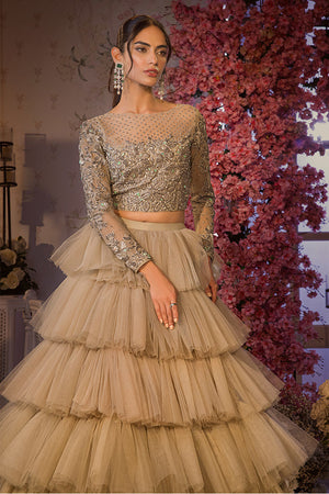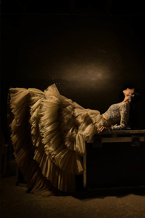 With a voluminous bustle and its exclusive brush stroke embroidery, our black kalidaar is made with pure raw silk with Kashmiri embroidery bootis all over the silhouette. Paired with a statement piece, heirloom chaadar is made with pure self jamawar with mughal miniature Kashmiri embroidery.