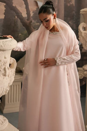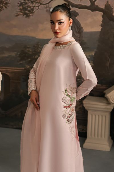 Aylin is an ethereal powder-pink raw silk straight shirt, adorned with intricate 3D embellishments along the neckline and cuffs. The whole look is elevated with flared raw silk pants and an organza dupatta delicately framed with sequin borders, striking the perfect balance between grace and elegance. Refined yet timeless, this look embodies pure sophistication.