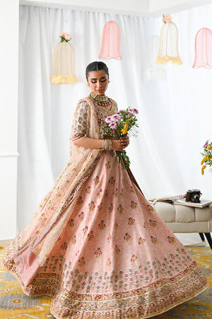 Exquisite and feminine, this salmon pink raw silk discharge print lehenga choli is a must-have. This elegant ensemble features block prints and is complemented by an organza net kamdani dupatta with discharge printed borders. Handcrafted with meticulous gota work, sequins, and cut dana, this outfit epitomizes refined luxury and grace.