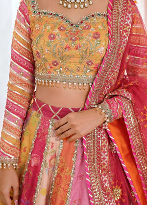 Experience the stunning lehenga choli featuring exquisite botanical embroidery and a vibrant color palette that perfectly balances elegance and joy for any occasion. The addition of a net dupatta enhances the design, making it dynamic and truly expressive. This piece is a bold choice that will make you stand out.