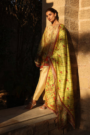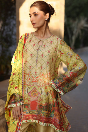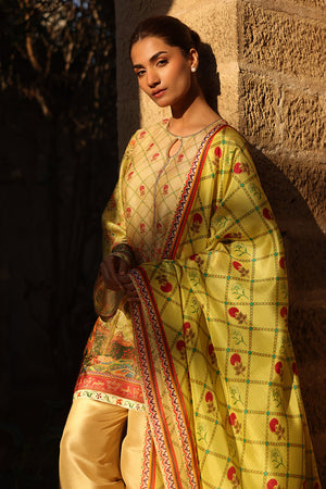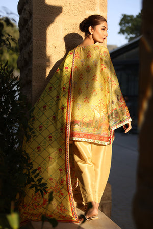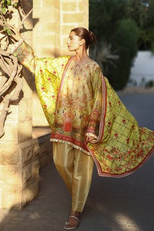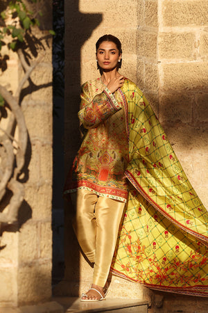 Step into a realm of vibrant artistry with a striking printed ensemble. A lavish cotton net shirt showcases a golden citrus and vermilion blush hued mughal inspired print with a zardoze embroidered keyhole neckline. Complemented by a patterned medium silk dupatta in a brighter shade. Paired with a matching pure rawsilk shalwar.