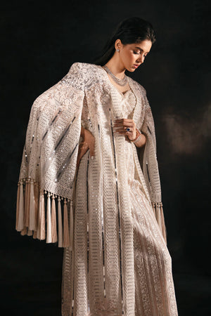 Enveloped in ethereal whispers of pastel pink and white hues, this couture masterpiece exudes divine beauty. Adorned with intricate silk- thread embroidery and delicately placed tassels, it orchestrates a blossomic symphony of elegance and grace, defining the essence of high-end femininity.