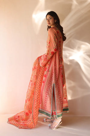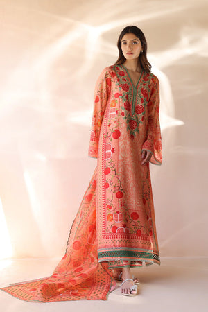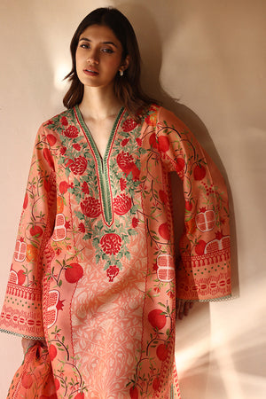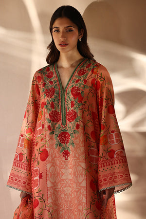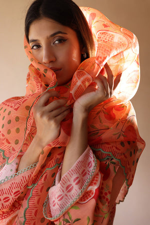 A poetic fusion of tradition and modernity, this khaddi silk ensemble in a soft tangerine hue features an a-line shirt featuring a vivid scarlet pomegranate print and aari embroidery on the neckline with verdant accents. Paired with an organza dupatta adorned with a painterly print and embroidered culottes.