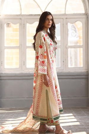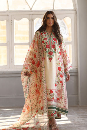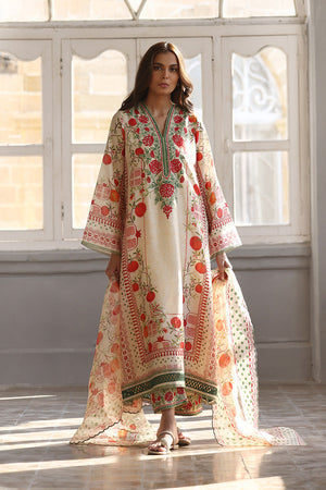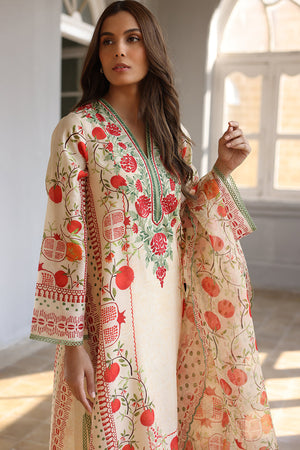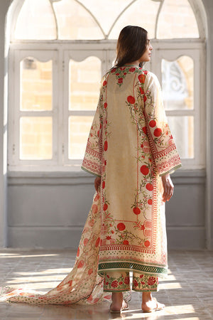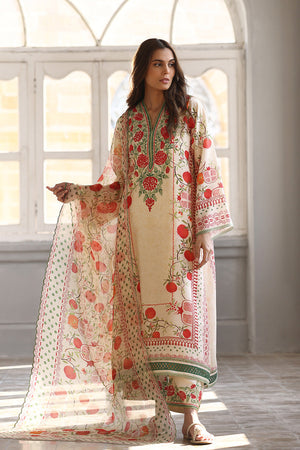 A poetic fusion of tradition and modernity, this khaddi silk ensemble in a soft cream hue features an a-line shirt featuring a vivid scarlet pomegranate print and aari embroidery on the neckline with verdant accents. Paired with an organza dupatta adorned with a painterly print and embroidered culottes.