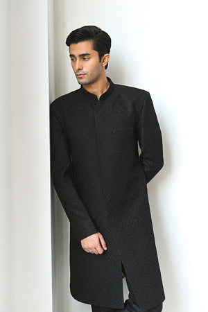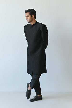 Crafted from a deep hued ebony pure rawsilk, this sherwani exudes understated luxury with its textured embroidered pattern. Lined in the finest medium silk with our signature print, it features sophisticated pleated details on the collar and the pocket. Paired with matching pure rawsilk trousers, this ensemble is a classic.