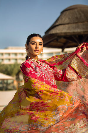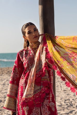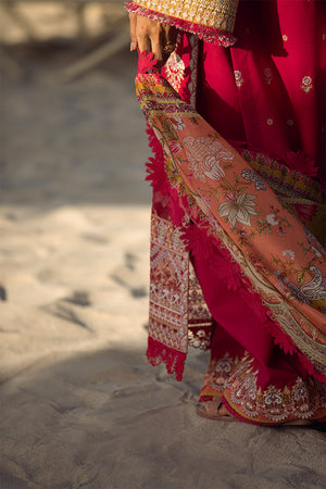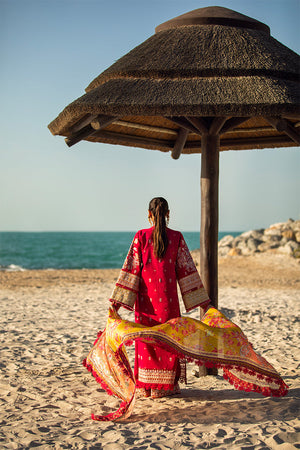 This crimson front-open shirt is as lovely as a pure jewel hue and has composed sleeves. A combination of processing techniques are used to create the gorgeous silk embroidery patches in contrasting colors on the sleeves. On a flowy lawn shirt, the front organza border is exquisitely pre-worked to enhance the look. It has geometrical printed silk finishing inside the shirt. It is pared with cambric palazzo pants with embroidered organza patch on its border and silk printed dupatta in vibrant hues and beautiful floral patterns to further complement the look.