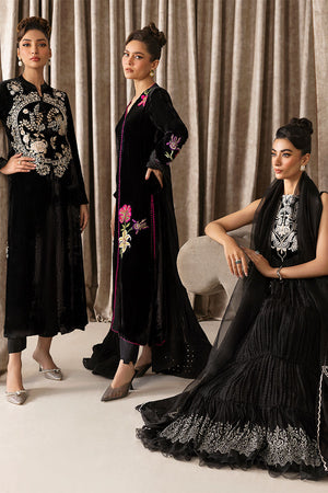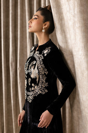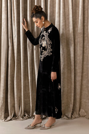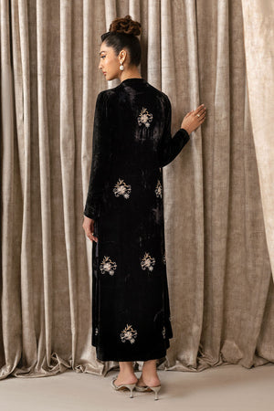 A gorgeous black pure silk velvet Jacket has beautiful thread work embroidery in front and back motives. Thread work is further enhanced with dabka, pearl and sequins.
