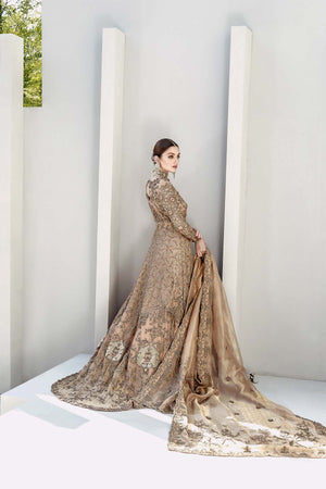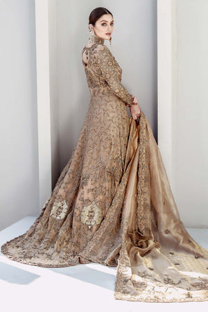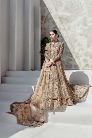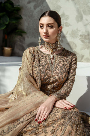 An eternal shade of peachy gold, featuring the most intricate gold embellishment, laden with sparkling cutdana and swarovski with hand embroidered rosettes.The kalidar shirt features hand made jaalis and 3D embellishment for a classic yet contemporary feel. Complemented by jamawar lehnga with cascading embellished booties and borders. The real beauty is the dupatta which is a peachy gold tissue featuring 3D flowers sprayed with swarovski and four side border.