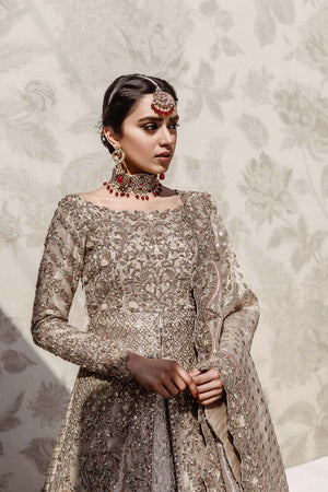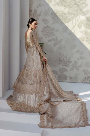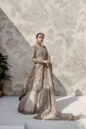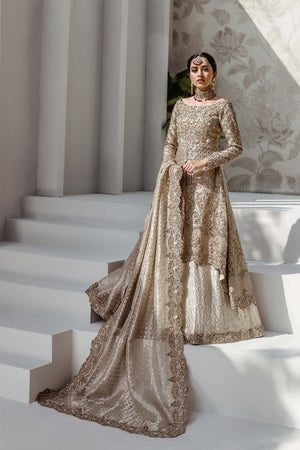 Eternal gold tissue bridal, it has intricate 3D flower and zardozi work with accent of light pink and green thread french knots. Rich Jamawar is used for lehnga enhanced with work at the bottom and trail at the back. The tissue dupatta is filled with gota work in the Center and thick border on the four sides.Fabric: Tissue & Jamawar