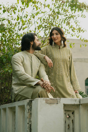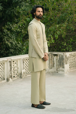 A short cotton kurta, trousers, and waistcoat set featuring repeats of ambi paisley motifs embroidered on the waistcoat in tone-on-tone anchor and Resham work. The kurta’s neckline and sleeve borders are detailed with ari embroidery, adding a subtle contrast. Ideal for celebrating Eid with loved ones, from the quiet reverence of the mosque to the warmth of the dining table.