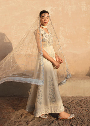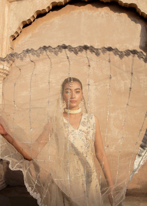 Bahaar, the ivory ensemble is a classic pishwaas handworked with kora, tilla and dabka, sequins and pearls in shades of silver. The pishwaas comes with churidaar pants. The dupatta comesin net with Tilla worked borders.